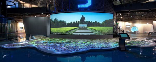 在一個相對封閉的空間內(多功能播放室),屏幕上的超長跨度的廣闊畫面充滿觀賞者的視野,